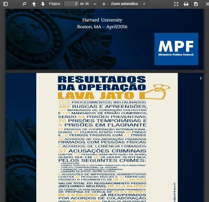 A relação com os americanos mais além da parceria é demonstrada por outro documento vazado, uma apresentação em PowerPoint feito por Deltan Dallagnol para uma apresentação sobre a Força-Tarefa Lava Jato na Universidade de Harvard, nos EUA, em abril de 2016.