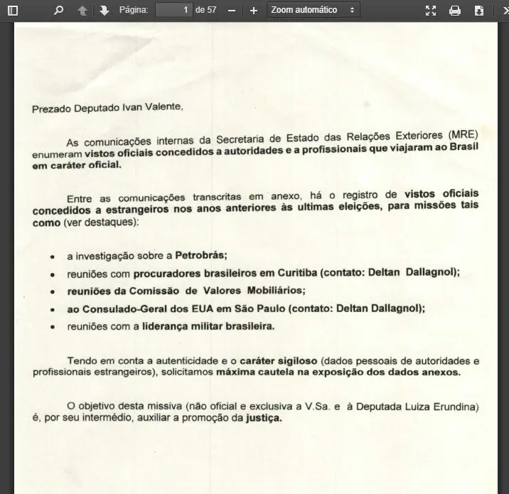 A revelação consta de uma lista de vistos concedidos a representantes do governo americano para o Brasil nos anos de 2015 e 2016. A lista foi enviada pela Secretaria de Estado das Relações Exteriores do Itamaraty ao Deputado Federal Ivan Valente após um pedido de esclarecimentos.
