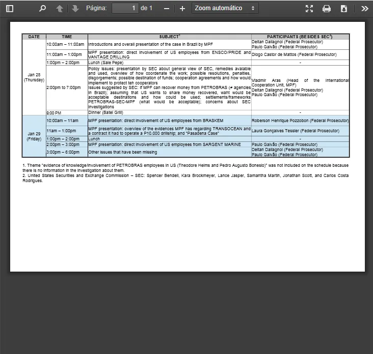 Do lado brasileiro, participaram da reunião os procuradores Deltan Dallagnol, Paulo Galvão, Diogo Castor de Mattos, Roberson Henrique Pozzobon, Laura Gonçalves Tessler e Vladimir Aras. O grupo da SEC incluía os advogados Spencer Bendell, Kara Brockmeyer, Lance Jasper, Samantha Martin, Jonathan Scott, e Carlos Costa Rodrigues.
